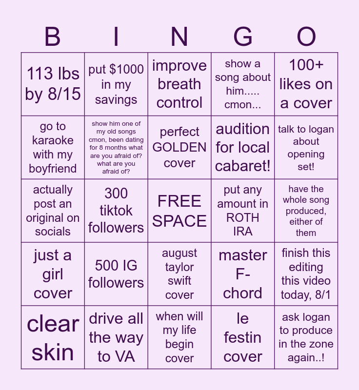 This bingo card has a free space and 24 words: 500 IG followers, drive all the way to VA, perfect GOLDEN cover, clear skin, 100+ likes on a cover, 113 lbs by 8/15, go to karaoke with my boyfriend, put $1000 in my savings, put any amount in ROTH IRA, august taylor swift cover, audition for local cabaret!, actually post an original on socials, master F-chord, finish this editing this video today, 8/1, show him one of my old songs cmon, been dating for 8 months what are you afraid of? what are you afraid of?, le festin cover, have the whole song produced, either of them, improve breath control, talk to logan about opening set!, 300 tiktok followers, ask logan to produce in the zone again..!, just a girl cover, show a song about him..... cmon... and when will my life begin cover.