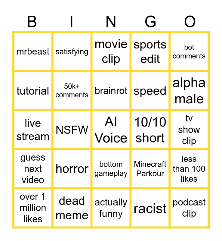 This bingo card has 25 words: horror, actually funny, brainrot, over 1 million likes, bot comments, mrbeast, tutorial, satisfying, 10/10 short, bottom gameplay, speed, live stream, Minecraft Parkour, less than 100 likes, 50k+ comments, podcast clip, tv show clip, movie clip, alpha male, NSFW, AI Voice, dead meme, guess next video, sports edit and racist.
