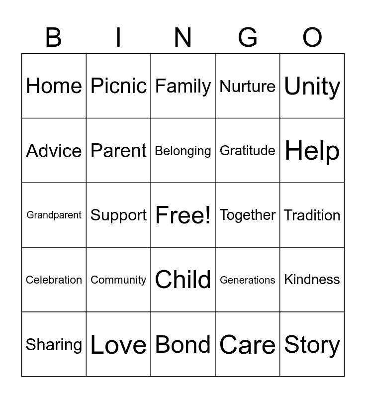 This bingo card has a free space and 30 words: Love, Hug, Support, Laughter, Home, Family, Parent, Child, Together, Bond, Tradition, Story, Care, Respect, Help, Memory, Generations, Celebration, Community, Unity, Grandparent, Sibling, Picnic, Gratitude, Advice, Nurture, Kindness, Sharing, Belonging and Roots.