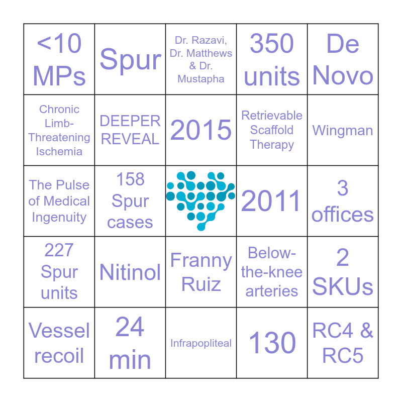 This bingo card has a free space and 37 words: May 29, 2025, 115 employees, San Clemente, CA, 2011, 3 offices, 227 Spur units, 158 Spur cases, Peripheral Retrievable Stent System, Retrievable Scaffold Therapy, CLTI, Chronic Limb-Threatening Ischemia, DEEPER REVEAL, 130, De Novo, <10 MPs, 24 min, Franny Ruiz, 350 units, Wingman, The Pulse of Medical Ingenuity, Spur, 2015, 1 year, 2 SKUs, 65 mm, 60 mm, Dr. Razavi, Dr. Matthews & Dr. Mustapha, 4 times, 99.2%, 96.9%, 2.5 mm to 4.5 mm, Infrapopliteal, Below-the-knee arteries, RC4 & RC5, Vessel recoil, Nitinol and Gold.