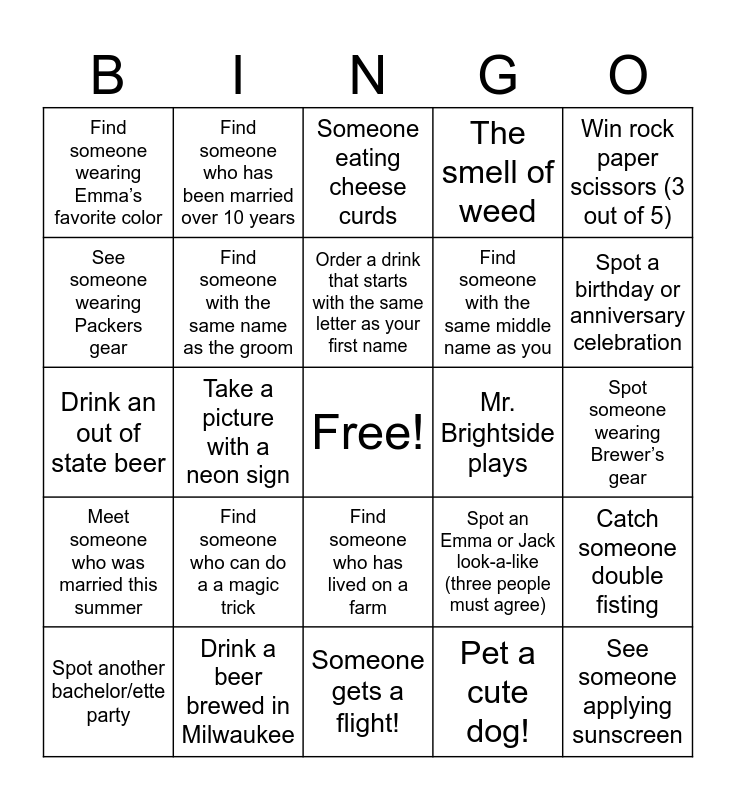 This bingo card has a free space and 34 words: Someone mentions Leslie Knope, Pet a cute dog!, Spot an Illinois license plates, Meet someone else named Emma, Meet someone who was married this summer, Find someone with the same name as the groom, Win rock paper scissors (3 out of 5), Spot another bachelor/ette party, Find someone who has been married over 10 years, Spot someone wearing a band shirt, Order a drink that starts with the same letter as your first name, Someone eating cheese curds, Correctly guess the beer/drink someone in the group will order, Find someone with the same name as you, Mr. Brightside plays, Spot a birthday or anniversary celebration, Drink a beer brewed in Milwaukee, Drink an out of state beer, Find someone who can do a a magic trick, Spot an Emma or Jack look-a-like (three people must agree), Find someone who has lived on a farm, See someone applying sunscreen, Find someone wearing Emma’s favorite color, Spot someone wearing Brewer’s gear, Someone gets a flight!, See someone applying sunscreen, The smell of weed, Name 10 cocktails in 30 seconds, Find someone with the same middle name as you, See someone wearing Packers gear, Spot PDA, Take a picture with a neon sign, Catch someone double fisting and Collect three souvenirs from bars/restaurants.
