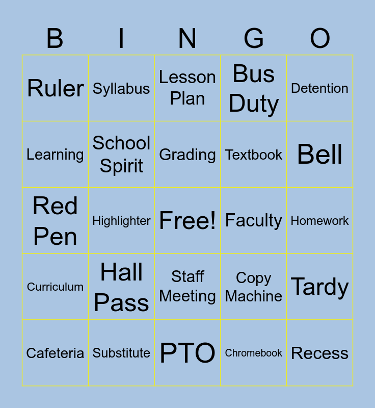 This bingo card has a free space and 42 words: Coffee, Grading, Pencil, Hall Pass, Chromebook, Tardy, Recess, Assembly, Lesson Plan, Staff Meeting, Homework, Bell, Highlighter, Detention, Sticky Notes, Copy Machine, Professional Development, Red Pen, Parent Email, Syllabus, Learning, Whiteboard, Sharpener, Ruler, Classroom, Late Work, Textbook, Absent, Teamwork, Homeroom, Lunch Duty, Curriculum, School Spirit, PTO, School Nurse, Cafeteria, Substitute, Faculty, Extra Credit, Principal, Bus Duty and Icebreaker.