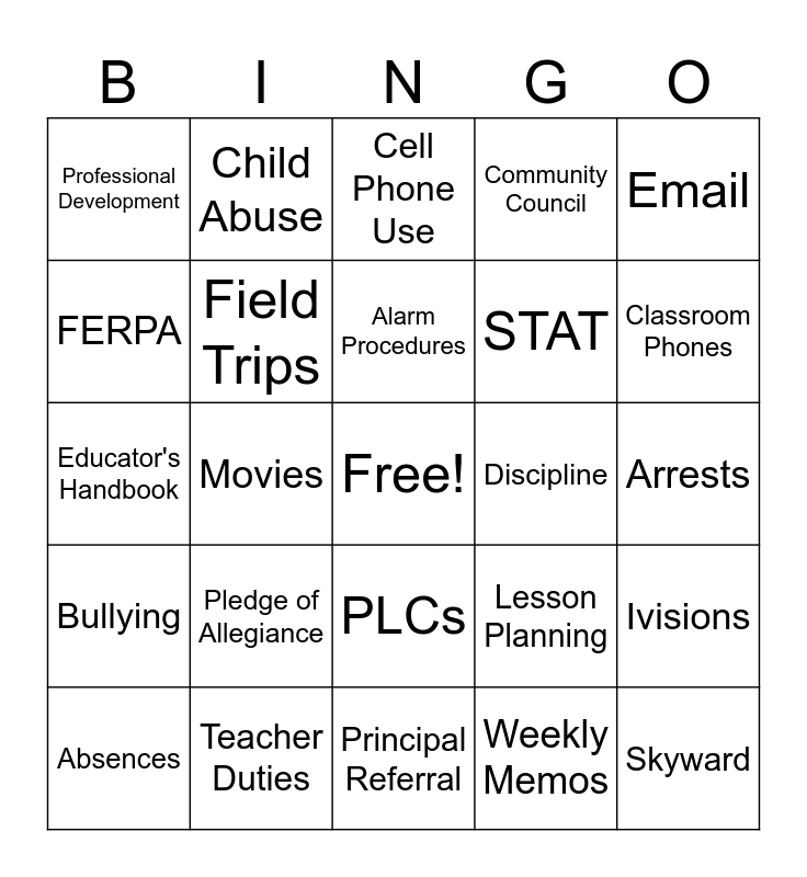 This bingo card has a free space and 29 words: Absences, Staff Dress Code, Movies, Student Supervision, Professional Development, Cell Phone Use, Field Trips, Pledge of Allegiance, Discipline, Teacher Duties, Arrests, Skyward, Principal Referral, Weekly Memos, Classroom Phones, Gum, PLCs, Bullying, Email, Educator's Handbook, Lesson Planning, Staff Meetings, STAT, FERPA, Community Council, Child Abuse, Ivisions, Alarm Procedures and Emergency Drills.
