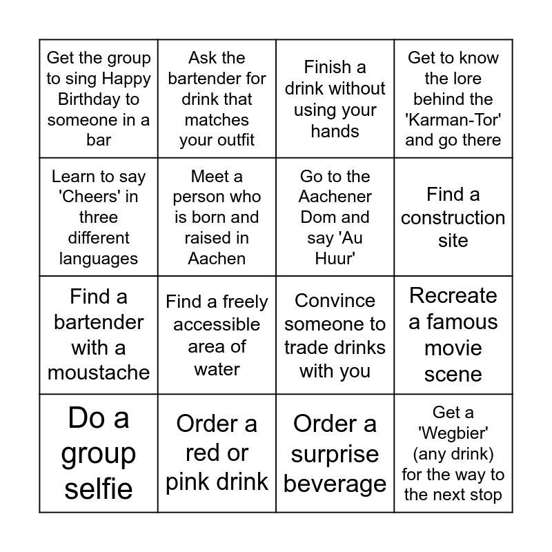 This bingo card has 16 words: Order a red or pink drink, Recreate a famous movie scene, Finish a drink without using your hands, Get the group to sing Happy Birthday to someone in a bar, Find a bartender with a moustache, Ask the bartender for drink that matches your outfit, Convince someone to trade drinks with you, Order a surprise beverage, Learn to say 'Cheers' in three different languages, Meet a person who is born and raised in Aachen, Do a group selfie, Get to know the lore behind the 'Karman-Tor' and go there, Find a freely accessible area of water, Find a construction site, Go to the Aachener Dom and say 'Au Huur' and Get a 'Wegbier' (any drink) for the way to the next stop.