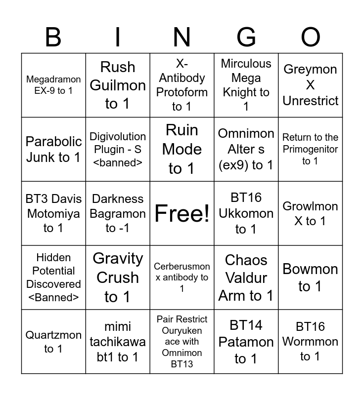 This bingo card has a free space and 24 words: Gravity Crush to 1, mimi tachikawa bt1 to 1, Ruin Mode to 1, Quartzmon to 1, Greymon X Unrestrict, Megadramon EX-9 to 1, Parabolic Junk to 1, Rush Guilmon to 1, BT16 Ukkomon to 1, Cerberusmon x antibody to 1, Omnimon Alter s (ex9) to 1, BT3 Davis Motomiya to 1, Chaos Valdur Arm to 1, Bowmon to 1, Digivolution Plugin - S <banned>, BT14 Patamon to 1, Growlmon X to 1, X-Antibody Protoform to 1, Return to the Primogenitor to 1, Darkness Bagramon to -1, BT16 Wormmon to 1, Hidden Potential Discovered <Banned>, Mirculous Mega Knight to 1 and Pair Restrict Ouryuken ace with Omnimon BT13.