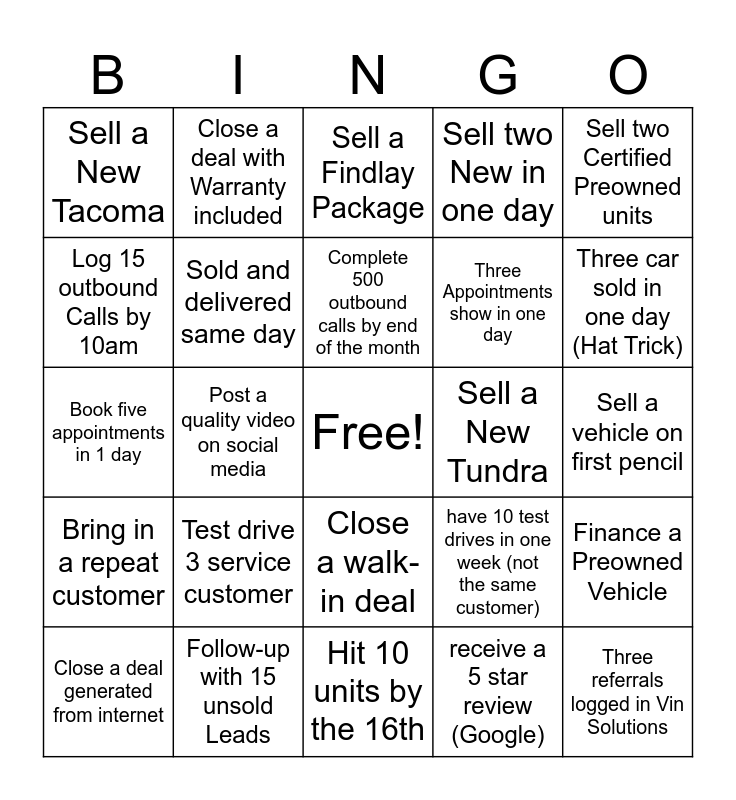 This bingo card has a free space and 24 words: Test drive 3 service customer, Follow-up with 15 unsold Leads, Complete 500 outbound calls by end of the month, Close a deal generated from internet, Sell two Certified Preowned units, Sell a New Tacoma, Log 15 outbound Calls by 10am, Close a deal with Warranty included, Sell a New Tundra, Close a walk-in deal, Three Appointments show in one day, Book five appointments in 1 day, have 10 test drives in one week (not the same customer), Finance a Preowned Vehicle, Sold and delivered same day, receive a 5 star review (Google), Sell a vehicle on first pencil, Sell a Findlay Package, Three car sold in one day (Hat Trick), Post a quality video on social media, Three referrals logged in Vin Solutions, Bring in a repeat customer, Sell two New in one day and Hit 10 units by the 16th.