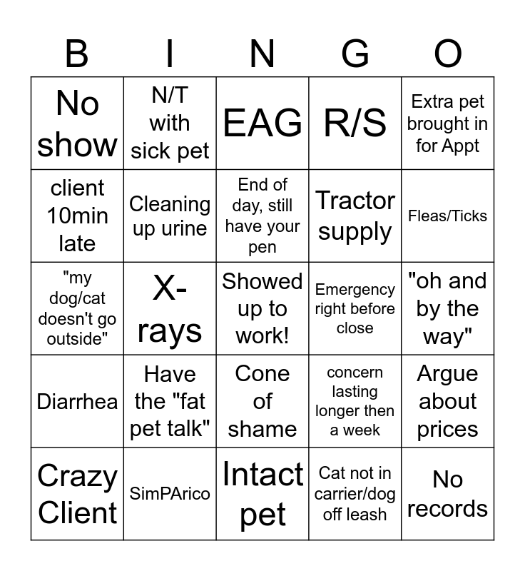This bingo card has a free space and 24 words: Crazy Client, Have the "fat pet talk", End of day, still have your pen, Cat not in carrier/dog off leash, Extra pet brought in for Appt, No show, N/T with sick pet, EAG, Emergency right before close, "oh and by the way", "my dog/cat doesn't go outside", Cleaning up urine, concern lasting longer then a week, Argue about prices, client 10min late, SimPArico, Intact pet, R/S, Fleas/Ticks, Diarrhea, X-rays, Cone of shame, Tractor supply and No records.