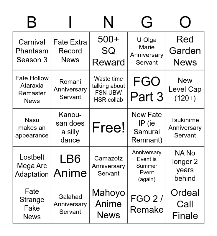 This bingo card has a free space and 24 words: LB6 Anime, Galahad Anniversary Servant, Waste time talking about FSN UBW HSR collab, Fate Strange Fake News, Red Garden News, Carnival Phantasm Season 3, Fate Hollow Ataraxia Remaster News, Fate Extra Record News, New Fate IP (ie Samurai Remnant), Camazotz Anniversary Servant, FGO Part 3, Nasu makes an appearance, Anniversary Event is Summer Event (again), NA No longer 2 years behind, Romani Anniversary Servant, FGO 2 / Remake, Tsukihime Anniversary Servant, 500+ SQ Reward, New Level Cap (120+), Kanou-san does a silly dance, Ordeal Call Finale, Lostbelt Mega Arc Adaptation, U Olga Marie Anniversary Servant and Mahoyo Anime News.