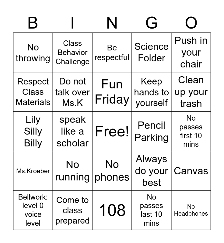 This bingo card has a free space and 29 words: Bellwork: level 0 voice level, Come to class on time, speak like a scholar, 3 Strike System, No throwing, Be respectful, Do not talk over Ms.K, No running, Pencil Parking, Come to class prepared, No passes first 10 mins, No Headphones, 108, No passes last 10 mins, Clean up your trash, Late work loses points, No phones, Ms.Kroeber, Push in your chair, Lily Silly Billy, Always do your best, Clap 1 time if you hear me, Keep hands to yourself, Respect Class Materials, Science Folder, Class Behavior Challenge, Canvas, Fun Friday and Kindness is cool.