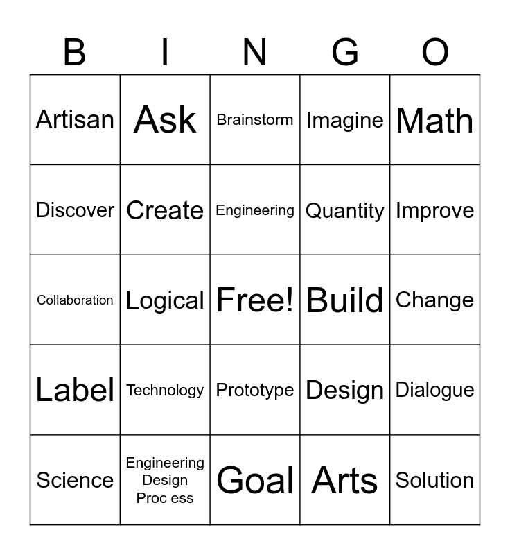 This bingo card has a free space and 24 words: Science, Technology, Engineering, Arts, Math, Artisan, Ask, Brainstorm, Build, Change, Collaboration, Create, Design, Dialogue, Discover, Engineering Design Proc ess, Goal, Imagine, Improve, Label, Logical, Prototype, Quantity and Solution.