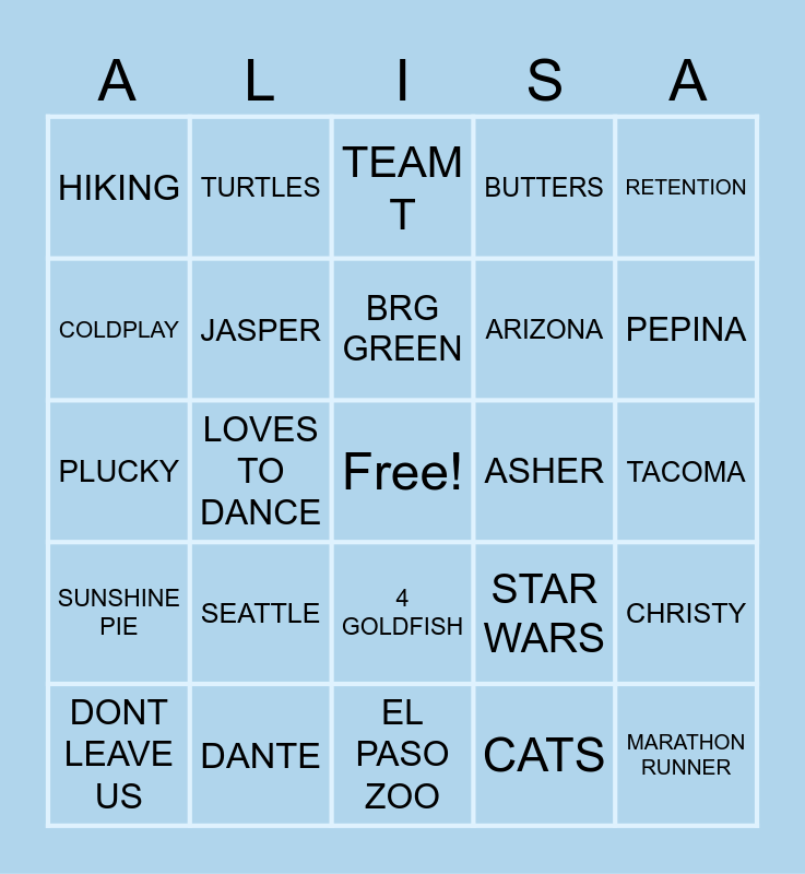 This bingo card has a free space and 24 words: SEATTLE, DANTE, BRG GREEN, DONT LEAVE US, RETENTION, HIKING, COLDPLAY, TURTLES, ASHER, 4 GOLDFISH, ARIZONA, PLUCKY, STAR WARS, CHRISTY, JASPER, CATS, TACOMA, TEAM T, PEPINA, LOVES TO DANCE, MARATHON RUNNER, SUNSHINE PIE, BUTTERS and EL PASO ZOO.