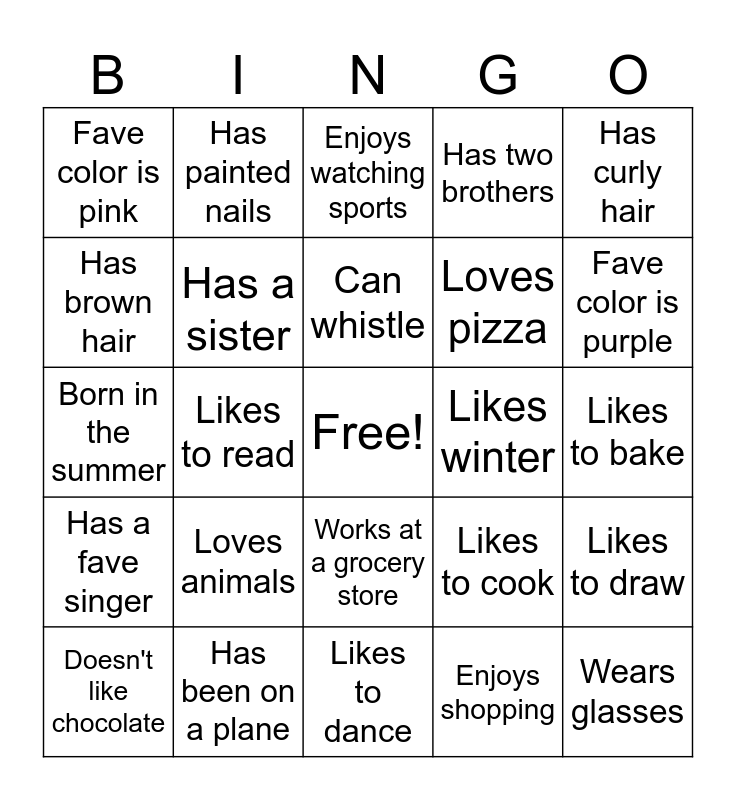This bingo card has a free space and 24 words: Loves animals, Has been on a plane, Can whistle, Doesn't like chocolate, Has curly hair, Fave color is pink, Has brown hair, Has painted nails, Likes winter, Works at a grocery store, Loves pizza, Born in the summer, Likes to cook, Likes to draw, Has a sister, Enjoys shopping, Likes to bake, Enjoys watching sports, Fave color is purple, Likes to read, Wears glasses, Has a fave singer, Has two brothers and Likes to dance.