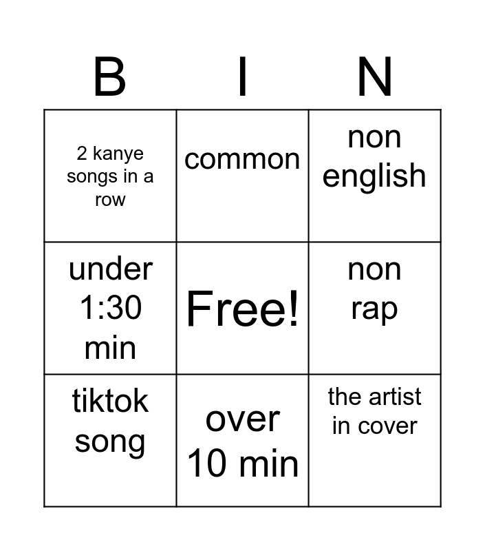 This bingo card has a free space and 8 words: non rap, non english, common, tiktok song, 2 kanye songs in a row, the artist in cover, under 1:30 min and over 10 min.
