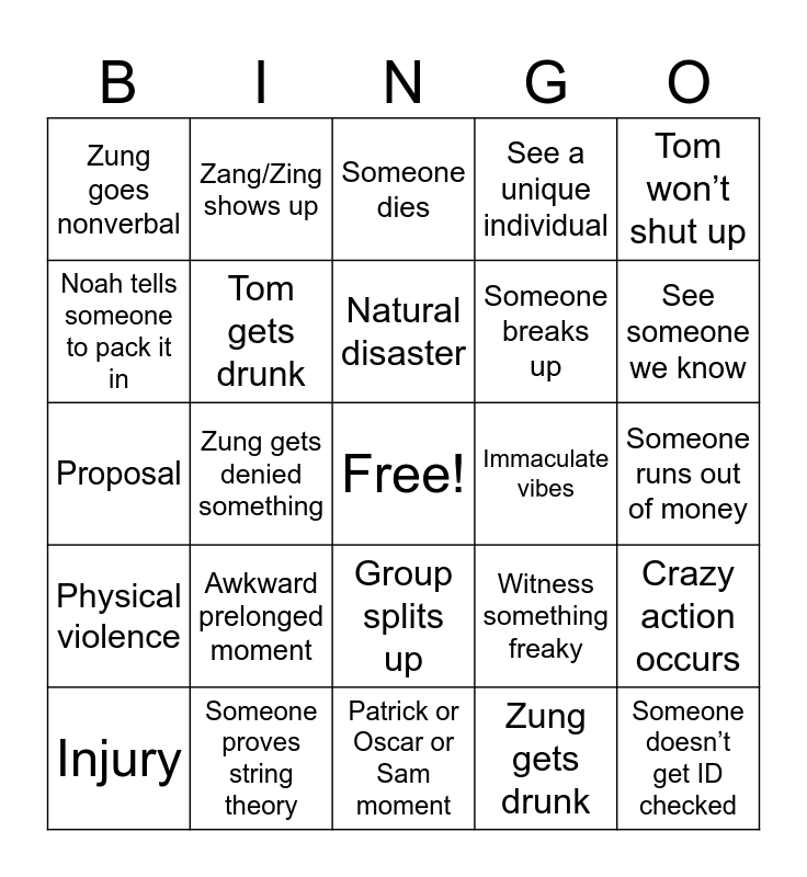 This bingo card has a free space and 24 words: Awkward prelonged moment, Someone proves string theory, Natural disaster, Injury, Tom won’t shut up, Zung goes nonverbal, Noah tells someone to pack it in, Zang/Zing shows up, Immaculate vibes, Group splits up, Someone breaks up, Proposal, Witness something freaky, Crazy action occurs, Tom gets drunk, Zung gets drunk, Someone runs out of money, Someone dies, See someone we know, Zung gets denied something, Someone doesn’t get ID checked, Physical violence, See a unique individual and Patrick or Oscar or Sam moment.