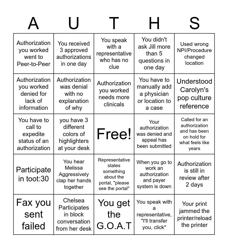 This bingo card has a free space and 24 words: You hear Melissa Aggressively clap her hands together, Chelsea Participates in block conversation from her desk, Authorization you worked needs more clinicals, Fax you sent failed, Used wrong NPI/Procedure changed location, Authorization you worked went to Peer-to-Peer, Authorization you worked denied for lack of information, You received 3 approved authorizations in one day, Your authorization was denied and appeal has been submitted, Representative states something about the portal, "please see the portal", You have to manually add a physician or location to a case, You have to call to expedite status of an authorization, When you go to work an authorization and payer system is down, Authorization is still in review after 2 days, Authorization was denial with no explanation of why, You speak with a representative, "I'll transfer you, click", Called for an authorization and has been on hold for what feels like years, You speak with a representative who has no clue, Understood Carolyn's pop culture reference, you have 3 different colors of highlighters at your desk, Your print jammed the printer/reload the printer, Participate in toot:30, You didn't ask Jill more than 5 questions in one day and You get the G.O.A.T.