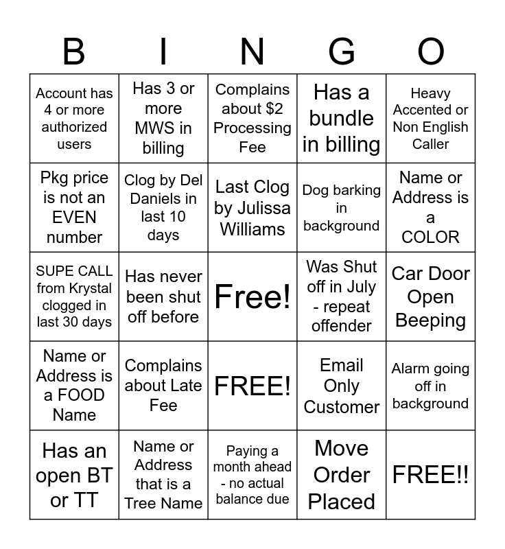 This bingo card has a free space and 24 words: Complains about Late Fee, Name or Address that is a Tree Name, Last Clog by Julissa Williams, Has an open BT or TT, Heavy Accented or Non English Caller, Account has 4 or more authorized users, Pkg price is not an EVEN number, Has 3 or more MWS in billing, Was Shut off in July - repeat offender, FREE!, Dog barking in background, SUPE CALL from Krystal clogged in last 30 days, Email Only Customer, Alarm going off in background, Clog by Del Daniels in last 10 days, Move Order Placed, Car Door Open Beeping, Complains about $2 Processing Fee, Name or Address is a COLOR, Has never been shut off before, FREE!!, Name or Address is a FOOD Name, Has a bundle in billing and Paying a month ahead - no actual balance due.