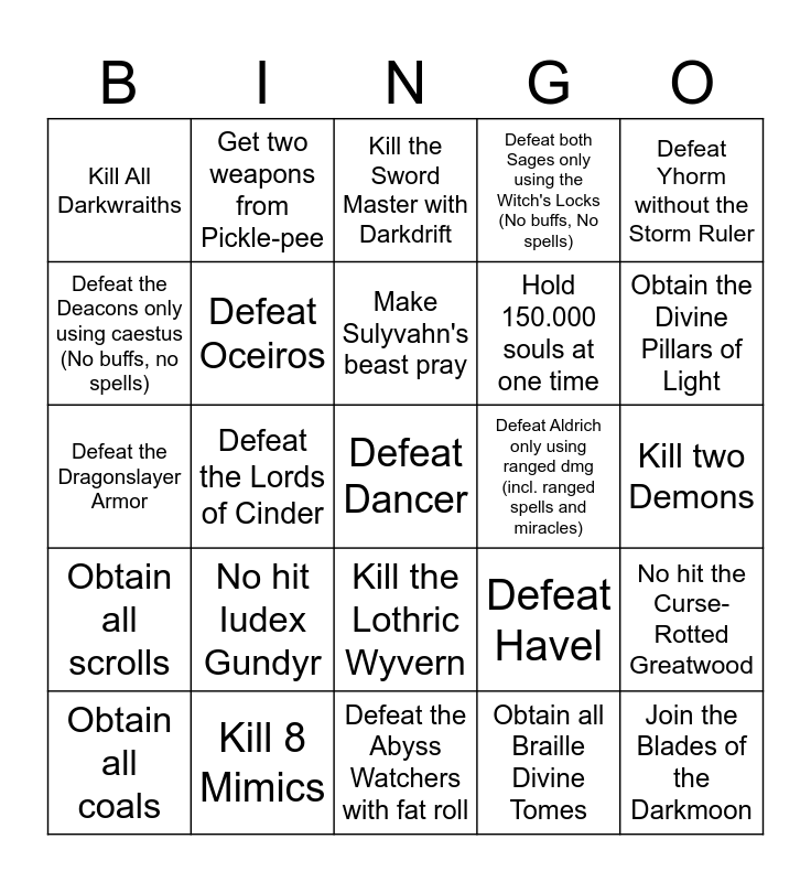 This bingo card has a free space and 24 words: No hit Iudex Gundyr, Kill 8 Mimics, Make Sulyvahn's beast pray, Obtain all coals, Defeat Yhorm without the Storm Ruler, Kill All Darkwraiths, Defeat the Deacons only using caestus (No buffs, no spells), Get two weapons from Pickle-pee, Defeat Aldrich only using ranged dmg (incl. ranged spells and miracles), Kill the Lothric Wyvern, Hold 150.000 souls at one time, Defeat the Dragonslayer Armor, Defeat Havel, No hit the Curse-Rotted Greatwood, Defeat Oceiros, Obtain all Braille Divine Tomes, Kill two Demons, Kill the Sword Master with Darkdrift, Obtain the Divine Pillars of Light, Defeat the Lords of Cinder, Join the Blades of the Darkmoon, Obtain all scrolls, Defeat both Sages only using the Witch's Locks (No buffs, No spells) and Defeat the Abyss Watchers with fat roll.
