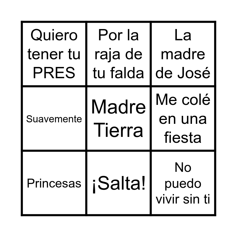 This bingo card has 50 words: Orgullo, Si antes te hubiera conocido, Que la detengan, Ave María, Potra salvaje, Torero, Por la raja de tu falda, Hay que venir al, Me colé en una fiesta, A quién le importa, Princesas, Suavemente, Mi gran noche, Macarena, Solo se vive una vez, Amigos para siempre, ¡Salta!, Más La chica yeyé, Despacito, Madre Tierra, Cómo te atreves, Cuando zarpa el amor, Quiero tener tu PRES, No puedo vivir sin ti, Carolina, El ataque de las chicas cocodrilo, Sabor de amor, Marta tiene un marcapasos, La madre de José, Clavado en un bar, Cien gaviotas, Soldadito, marinero, Nada que perder, La bicicleta, Marta, Sebas, Guille y los demás, Voy a Pasarmelo bien, Puedes contar conmigo, El toro guapo, Será porque te amo, Esa diva, Flying free, Física o Química, Todos los días sale el sol, Yo quiero bailar, Maricarmen, Tractor amarillo, Tenía tanto que darte, Chiquilla, 20 de abril and Aquí no hay playa.