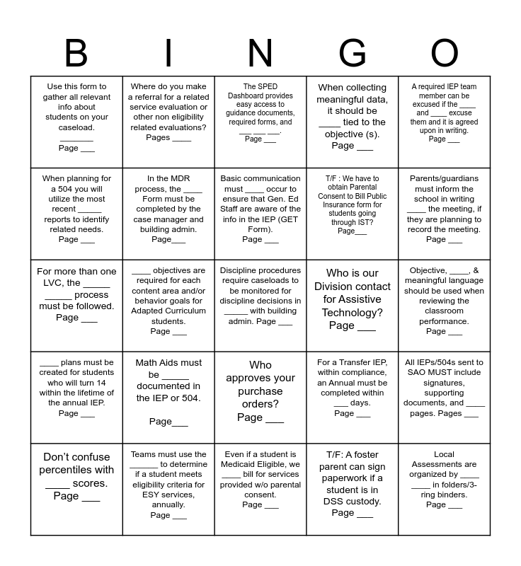 This bingo card has 25 words: Math Aids must be _____ documented in the IEP or 504. Page___, Even if a student is Medicaid Eligible, we ____ bill for services provided w/o parental consent. Page ___, Basic communication must ____ occur to ensure that Gen. Ed Staff are aware of the info in the IEP (GET Form). Page ___, Don’t confuse percentiles with ____ scores. Page ___, A required IEP team member can be excused if the ____ and ____ excuse them and it is agreed upon in writing. Page ___, Use this form to gather all relevant info about students on your caseload. _______ Page ___, When planning for a 504 you will utilize the most recent _____ reports to identify related needs. Page ___, Where do you make a referral for a related service evaluation or other non eligibility related evaluations? Pages ____, Who is our Division contact for Assistive Technology? Page ___, Who approves your purchase orders? Page ___, T/F : We have to obtain Parental Consent to Bill Public Insurance form for students going through IST? Page___, For more than one LVC, the _____ _____ process must be followed. Page ___, For a Transfer IEP, within compliance, an Annual must be completed within ___ days. Page ___, All IEPs/504s sent to SAO MUST include signatures, supporting documents, and ____ pages. Pages ___, In the MDR process, the ____ Form must be completed by the case manager and building admin. Page___, Local Assessments are organized by ____ ____ in folders/3-ring binders. Page ___, Objective, ____, & meaningful language should be used when reviewing the classroom performance. Page ___, The SPED Dashboard provides easy access to guidance documents, required forms, and ___ ___ ___. Page ___, Parents/guardians must inform the school in writing ____ the meeting, if they are planning to record the meeting. Page ___, ____ objectives are required for each content area and/or behavior goals for Adapted Curriculum students. Page ___, Discipline procedures require caseloads to be monitored for discipline decisions in _____ with building admin. Page ___, Teams must use the ______ to determine if a student meets eligibility criteria for ESY services, annually. Page ___, ____ plans must be created for students who will turn 14 within the lifetime of the annual IEP. Page ___, When collecting meaningful data, it should be ____ tied to the objective (s). Page ___ and T/F: A foster parent can sign paperwork if a student is in DSS custody. Page ___.