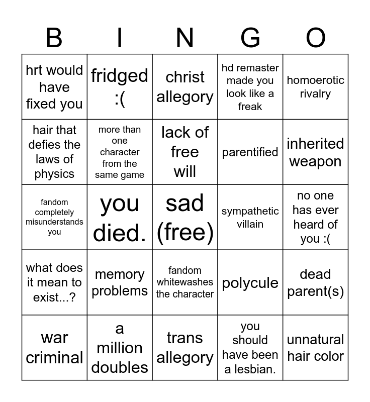 This bingo card has a free space and 24 words: memory problems, a million doubles, lack of free will, war criminal, homoerotic rivalry, hrt would have fixed you, hair that defies the laws of physics, fridged :(, sympathetic villain, fandom whitewashes the character, parentified, fandom completely misunderstands you, polycule, dead parent(s), more than one character from the same game, you should have been a lesbian., no one has ever heard of you :(, christ allegory, inherited weapon, you died., unnatural hair color, what does it mean to exist...?, hd remaster made you look like a freak and trans allegory.