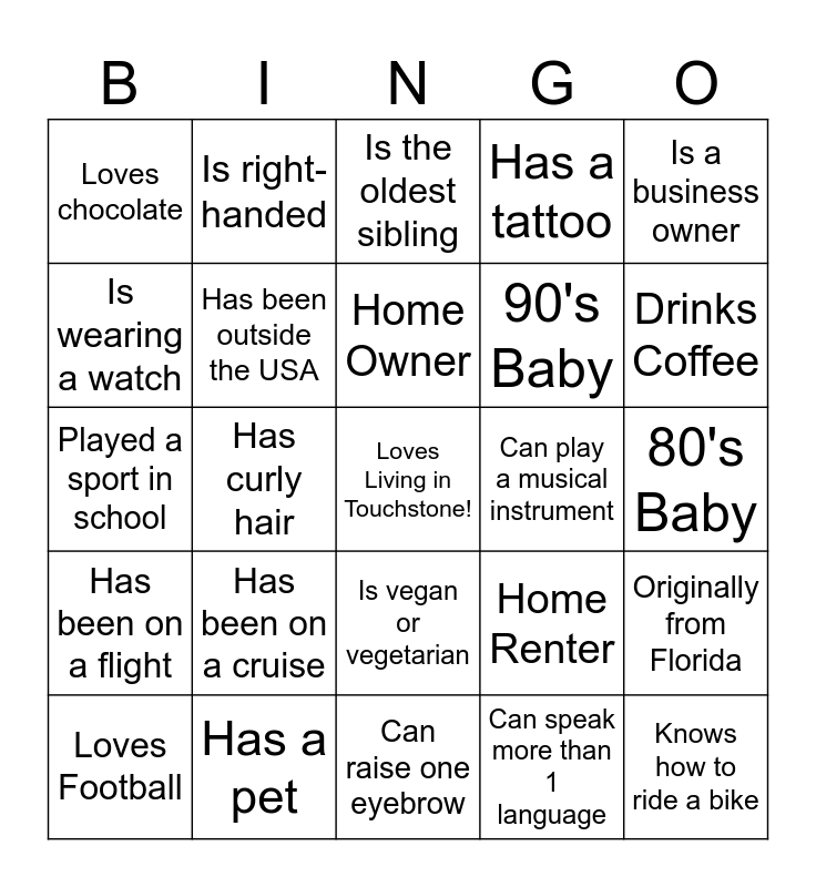 This bingo card has a free space and 24 words: Has been on a cruise, Has a pet, Home Owner, Loves Football, Is a business owner, Loves chocolate, Is wearing a watch, Is right-handed, Can play a musical instrument, Is vegan or vegetarian, 90's Baby, Played a sport in school, Home Renter, Originally from Florida, Has been outside the USA, Can speak more than 1 language, 80's Baby, Is the oldest sibling, Drinks Coffee, Has curly hair, Knows how to ride a bike, Has been on a flight, Has a tattoo and Can raise one eyebrow.
