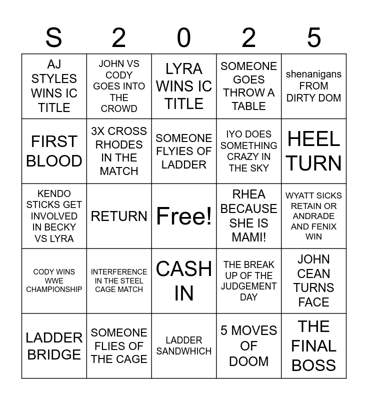 This bingo card has a free space and 24 words: INTERFERENCE IN THE STEEL CAGE MATCH, SOMEONE FLIES OF THE CAGE, SOMEONE FLYIES OF LADDER, LADDER BRIDGE, shenanigans FROM DIRTY DOM, AJ STYLES WINS IC TITLE, FIRST BLOOD, JOHN VS CODY GOES INTO THE CROWD, RHEA BECAUSE SHE IS MAMI!, CASH IN, IYO DOES SOMETHING CRAZY IN THE SKY, KENDO STICKS GET INVOLVED IN BECKY VS LYRA, THE BREAK UP OF THE JUDGEMENT DAY, JOHN CEAN TURNS FACE, 3X CROSS RHODES IN THE MATCH, 5 MOVES OF DOOM, WYATT SICKS RETAIN OR ANDRADE AND FENIX WIN, LYRA WINS IC TITLE, HEEL TURN, RETURN, THE FINAL BOSS, CODY WINS WWE CHAMPIONSHIP, SOMEONE GOES THROW A TABLE and LADDER SANDWHICH.