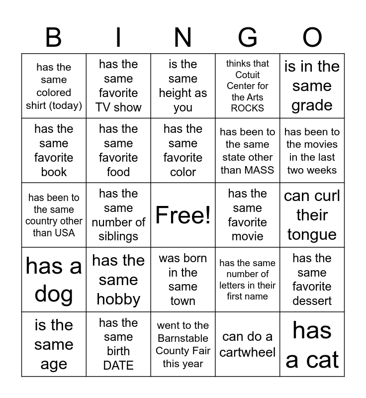 This bingo card has a free space and 24 words: has the same hobby, has the same birth DATE, has the same favorite color, is the same age, is in the same grade, has the same colored shirt (today), has the same favorite book, has the same favorite TV show, has the same favorite movie, was born in the same town, has been to the same state other than MASS, has been to the same country other than USA, has the same number of letters in their first name, has the same favorite dessert, has the same favorite food, can do a cartwheel, can curl their tongue, is the same height as you, has been to the movies in the last two weeks, has the same number of siblings, has a cat, has a dog, thinks that Cotuit Center for the Arts ROCKS and went to the Barnstable County Fair this year.
