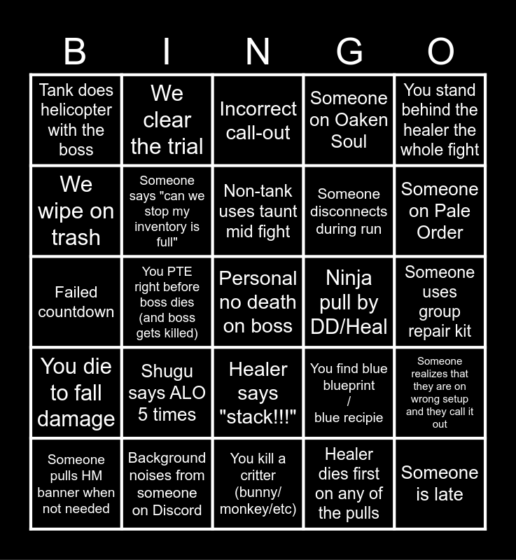 This bingo card has a free space and 24 words: Shugu says ALO 5 times, Background noises from someone on Discord, Non-tank uses taunt mid fight, Someone pulls HM banner when not needed, You stand behind the healer the whole fight, Tank does helicopter with the boss, We wipe on trash, We clear the trial, Ninja pull by DD/Heal, Healer says "stack!!!", Someone disconnects during run, Failed countdown, You find blue blueprint / blue recipie, Someone realizes that they are on wrong setup and they call it out, Someone says "can we stop my inventory is full", Healer dies first on any of the pulls, Someone uses group repair kit, Incorrect call-out, Someone on Pale Order, You PTE right before boss dies (and boss gets killed), Someone is late, You die to fall damage, Someone on Oaken Soul and You kill a critter (bunny/ monkey/etc).