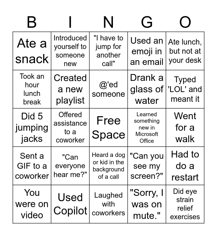 This bingo card has a free space and 24 words: "Can everyone hear me?", Used Copilot, @'ed someone, You were on video, Ate lunch, but not at your desk, Ate a snack, Took an hour lunch break, Introduced yourself to someone new, Learned something new in Microsoft Office, Heard a dog or kid in the background of a call, Drank a glass of water, Did 5 jumping jacks, "Can you see my screen?", Had to do a restart, Created a new playlist, "Sorry, I was on mute.", Went for a walk, "I have to jump for another call", Typed 'LOL' and meant it, Offered assistance to a coworker, Did eye strain relief exercises, Sent a GIF to a coworker, Used an emoji in an email and Laughed with coworkers.