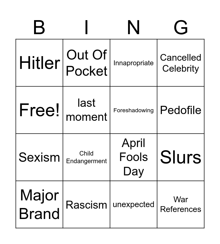 This bingo card has 16 words: Rascism, Slurs, Innapropriate, Hitler, Sexism, Out Of Pocket, April Fools Day, unexpected, Free!, last moment, Major Brand, Cancelled Celebrity, Child Endangerment, Pedofile, Foreshadowing and War References.