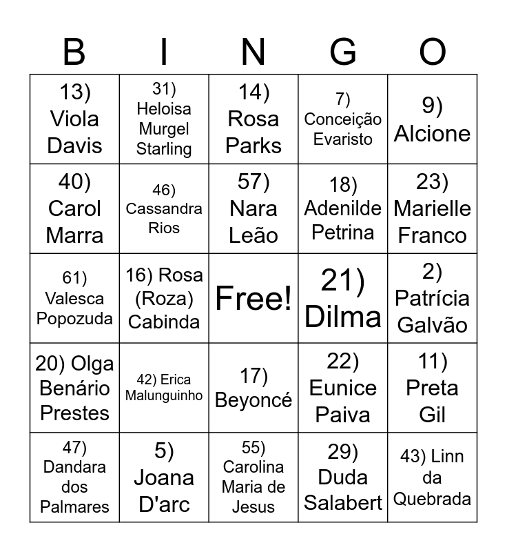 This bingo card has a free space and 70 words: 1) Marsha P. Johnson, 2) Patrícia Galvão, 3) Elis Regina, 4) Rita Lee, 5) Joana D'arc, 6) Frida Kahlo, 7) Conceição Evaristo, 8) Natalie Zemon Davies, 9) Alcione, 10) Marie Currie, 11) Preta Gil, 12) Marilyn Monroe, 13) Viola Davis, 14) Rosa Parks, 15) Tarsila do Amaral, 16) Rosa (Roza) Cabinda, 17) Beyoncé, 18) Adenilde Petrina, 19) Márcia Mura, 20) Olga Benário Prestes, 21) Dilma, 22) Eunice Paiva, 23) Marielle Franco, 24) Maria da Penha, 25) Célia Xakriabá, 26) Xuxa, 27) Oprah, 28) Anita Malfatti, 29) Duda Salabert, 30) Lilia Schwarcz, 31) Heloisa Murgel Starling, 32) Carolina Maria de Jesus, 33) Gal Costa, 34) Maria Bethânia, 35) Cássia Eller, 36) Maria Bonita, 37) Liniker, 38) Erika Hilton, 39) Djamila Ribeiro, 40) Carol Marra, 41) Lili Elbe, 42) Erica Malunguinho, 43) Linn da Quebrada, 44) Elza Soares, 45) Tia Ciata, 46) Cassandra Rios, 47) Dandara dos Palmares, 48) La Malinche, 49) Rita Lobato, 50) Rebeca Andrade, 51) Marta Vieira da Silva, 52) Lélia González, 53) Taís Araújo, 54) Nise da Silveira, 55) Carolina Maria de Jesus, 56) Chiquinha Gonzaga, 57) Nara Leão, 58) Clara Nunes, 59) Fafa de Belém, 60) Marina Lima, 61) Valesca Popozuda, 62) Iza, 63) Irmã Dulce, 64) Malala Yousafzai, 65) Greta Thunberg, 66) Angela Davis, 67) Katherine Johnson, 68) Rosa Luxemburgo, 69) Bertha Lutz and 70) Valentina Tereshkova.