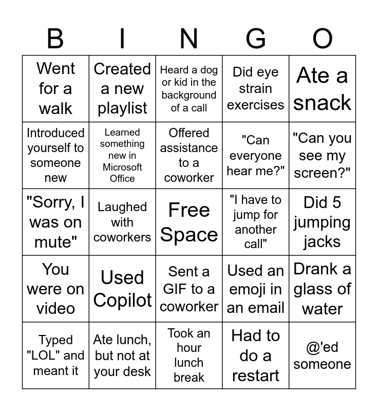 This bingo card has a free space and 24 words: Used Copilot, Ate lunch, but not at your desk, Offered assistance to a coworker, Typed "LOL" and meant it, Ate a snack, Went for a walk, Introduced yourself to someone new, Created a new playlist, "I have to jump for another call", Sent a GIF to a coworker, "Can everyone hear me?", "Sorry, I was on mute", Used an emoji in an email, Drank a glass of water, Learned something new in Microsoft Office, Had to do a restart, Did 5 jumping jacks, Heard a dog or kid in the background of a call, "Can you see my screen?", Laughed with coworkers, @'ed someone, You were on video, Did eye strain exercises and Took an hour lunch break.