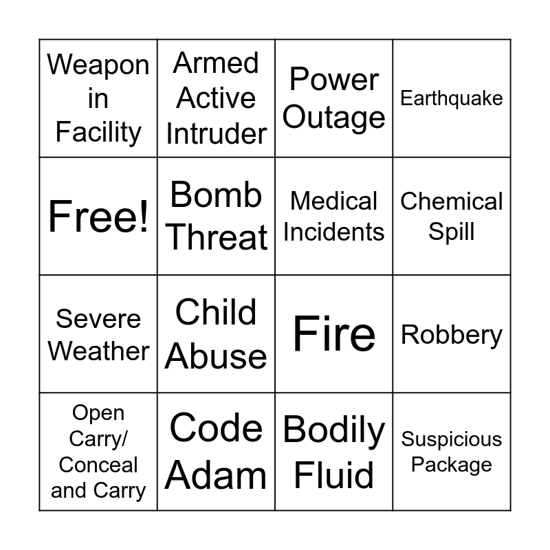 This bingo card has 16 words: Code Adam, Robbery, Power Outage, Weapon in Facility, Severe Weather, Armed Active Intruder, Fire, Bodily Fluid, Free!, Bomb Threat, Open Carry/ Conceal and Carry, Earthquake, Child Abuse, Chemical Spill, Medical Incidents and Suspicious Package.