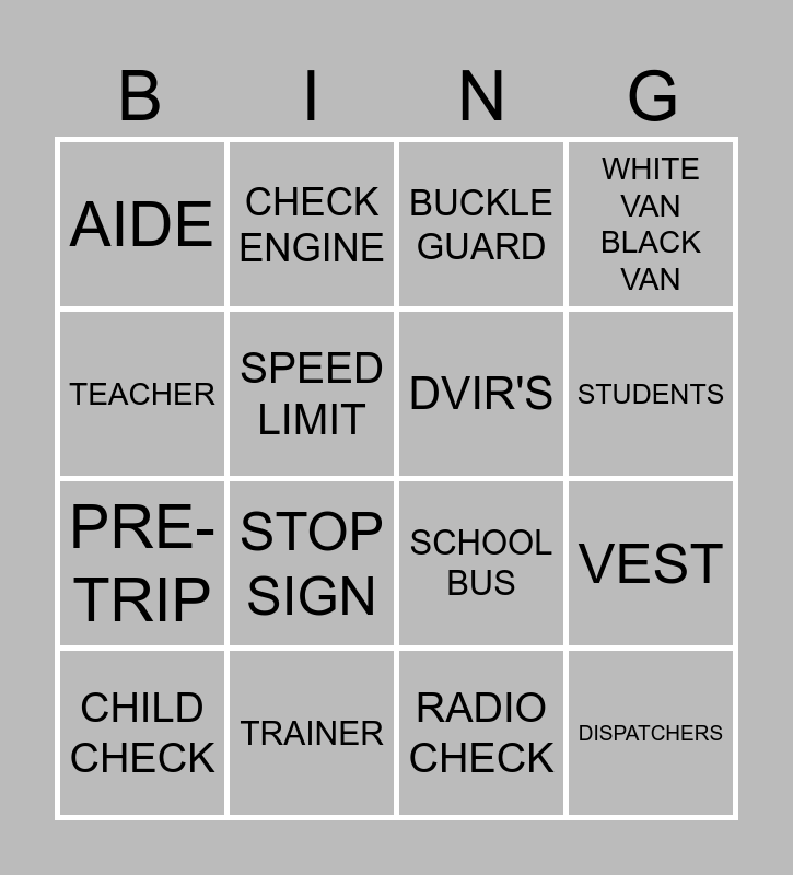 This bingo card has 17 words: Free!, CHILD CHECK, CHECK ENGINE, BUCKLE GUARD, VEST, TEACHER, STOP SIGN, DVIR'S, STUDENTS, PRE-TRIP, TRAINER, SCHOOL BUS, WHITE VAN BLACK VAN, AIDE, SPEED LIMIT, RADIO CHECK and DISPATCHERS.