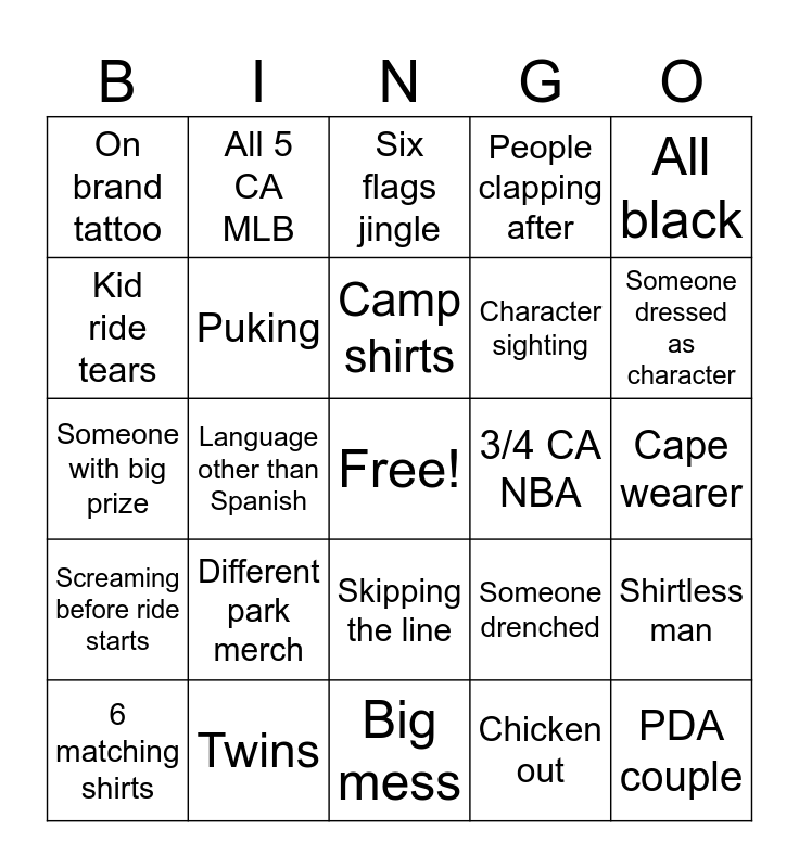 This bingo card has a free space and 24 words: Different park merch, Twins, Camp shirts, 6 matching shirts, All black, On brand tattoo, Kid ride tears, All 5 CA MLB, 3/4 CA NBA, Skipping the line, Character sighting, Someone with big prize, Someone drenched, Shirtless man, Puking, Chicken out, Cape wearer, Six flags jingle, Someone dressed as character, Language other than Spanish, PDA couple, Screaming before ride starts, People clapping after and Big mess.