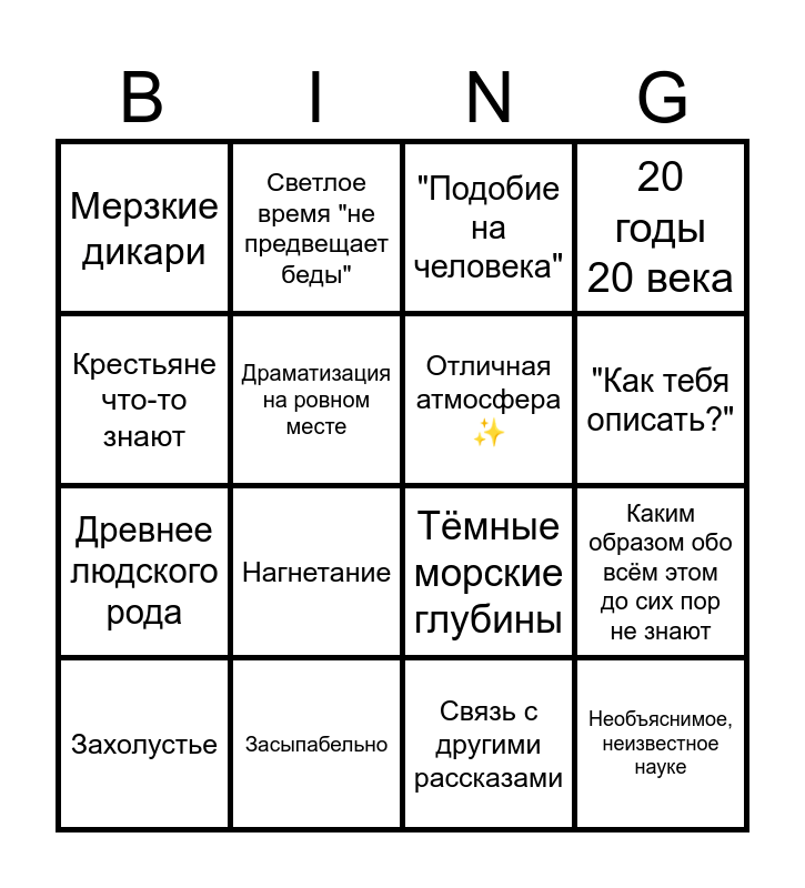 This bingo card has 25 words: От первого лица, мемуары, Потом обезумел, "Как тебя описать?", Зря он туда полез, Крестьяне что-то знают, Мерзкие дикари, Драматизация на ровном месте, Светлое время "не предвещает беды", Засыпабельно, Счётчик падений в обморок, Древнее людского рода, Тёмные морские глубины, Не верит в басни, "Галюны" или странные сны, Отличная атмосфера ✨, Упоминание чего-то из основы лора (В. Д, Нек. и т.п.), Связь с другими рассказами, "Подобие на человека", Нагнетание, Каким образом обо всём этом до сих пор не знают, Захолустье, Лор? Лор???, Необъяснимое, неизвестное науке, 20 годы 20 века and "Ктулху Фтагн".