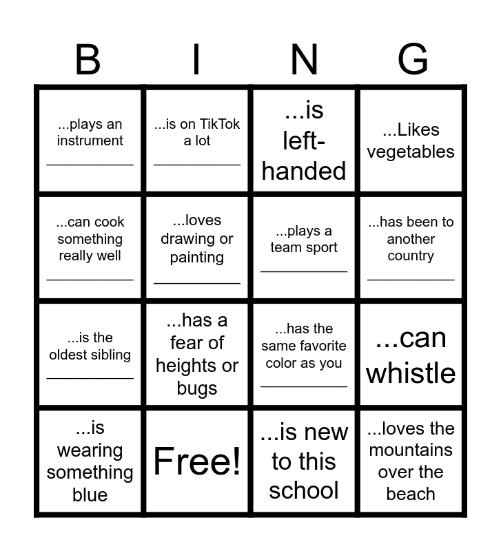 This bingo card has 25 words: ...plays a sport _______, ...speaks more than one language ___________, ...has been to another country ___________, ...prefers books over video games ___________, ...can cook something really well ___________, ...plays an instrument ___________, ...loves drawing or painting __________, ...is on TikTok a lot ___________, Free!, ...wants to travel the world ___________, ...is the oldest sibling ___________, ...has the same favorite color as you ___________, ...was born in a different state/country ___________, ...Likes pasta ___________, ...plays a team sport ___________, ...loves spicy food ___________, ...is new to this school, ...is left-handed, ...has a fear of heights or bugs, ...can whistle, ...is wearing something blue, ...loves scary movies, ...loves the mountains over the beach, ...Likes vegetables and ...Doesn't like chocolate.