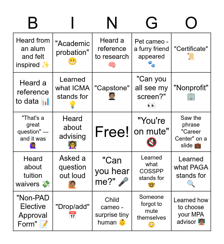 This bingo card has a free space and 24 words: Asked a question out loud 🙋🏽, "Drop/add" 📅, "Capstone" 🧑🏽🎓, "Non-PAD Elective Approval Form" 📝, "Certificate" 📜, Heard from an alum and felt inspired ✨, Heard a reference to data 📊, "Academic probation" 😬, "You're on mute" 🔇, "Can you hear me?" 🎤, "Can you all see my screen?" 👀, "That's a great question" — and it was 🙋🏾♀️, Learned what COSSPP stands for 🤓, Learned what PAGA stands for 🔍, Learned what ICMA stands for 💡, Someone forgot to mute themselves 😳, Saw the phrase "Career Center" on a slide 💼, Heard a reference to research 🧠, "Nonprofit" 🏢, Heard about advising 👩🏫, Learned how to choose your MPA advisor 🧑🏽🏫, Heard about tuition waivers 💸, Pet cameo - a furry friend appeared 🐾 and Child cameo - surprise tiny human 👶.
