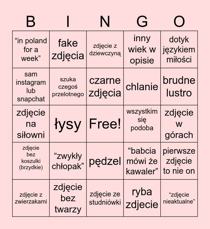 This bingo card has a free space and 32 words: ryba zdjecie, zdjęcie w grupie, łysy, gotowanie w opisie (makaron), zdjęcie bez koszulki (brzydkie), szuka czegoś przelotnego, dotyk językiem miłości, pierwsze zdjęcie to nie on, fake zdjęcia, memy w profilu, czarne zdjęcia, zdjęcie z dziewczyną, dziewczyna (opcjonalne), wymagania wobec dziewczyny w opisie, wszystkim się podoba, konto dla beki, zdjęcie z zwierzakami, zdjęcie na siłowni, pędzel, “zwykły chłopak”, “babcia mówi że kawaler”, biznesman, zdjęcie w górach, zdjęcie bez twarzy, “zdjęcie nieaktualne”, inny wiek w opisie, chlanie, sam instagram lub snapchat, “in poland for a week”, zdjęcie ze studniówki, wzrost w opisie (podobno ważne) and brudne lustro.