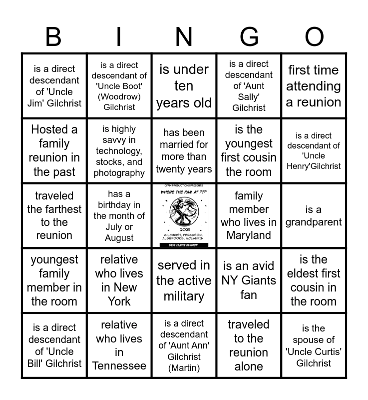 This bingo card has a free space and 24 words: relative who lives in New York, relative who lives in Tennessee, has been married for more than twenty years, is a direct descendant of 'Uncle Bill' Gilchrist, first time attending a reunion, is a direct descendant of 'Uncle Jim' Gilchrist, Hosted a family reunion in the past, is a direct descendant of 'Uncle Boot' (Woodrow) Gilchrist, family member who lives in Maryland, served in the active military, is the youngest first cousin the room, traveled the farthest to the reunion, is an avid NY Giants fan, is the eldest first cousin in the room, is highly savvy in technology, stocks, and photography, traveled to the reunion alone, is a grandparent, is under ten years old, is a direct descendant of 'Uncle Henry'Gilchrist, has a birthday in the month of July or August, is the spouse of 'Uncle Curtis' Gilchrist, youngest family member in the room, is a direct descendant of 'Aunt Sally' Gilchrist and is a direct descendant of 'Aunt Ann' Gilchrist (Martin).