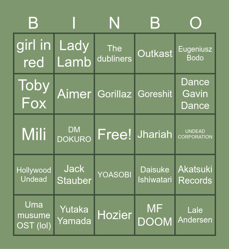 This bingo card has a free space and 24 words: Jack Stauber, Yutaka Yamada, Gorillaz, Uma musume OST (lol), Eugeniusz Bodo, girl in red, Toby Fox, Lady Lamb, Jhariah, YOASOBI, Goreshit, Mili, Daisuke Ishiwatari, Akatsuki Records, Aimer, MF DOOM, UNDEAD CORPORATION, The dubliners, Dance Gavin Dance, DM DOKURO, Lale Andersen, Hollywood Undead, Outkast and Hozier.