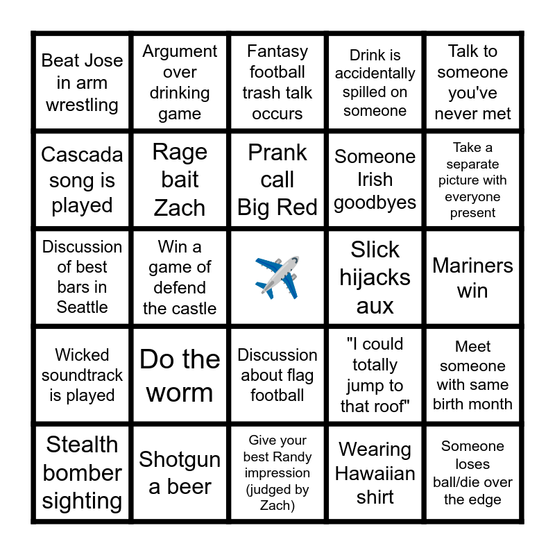This bingo card has a free space and 24 words: Do the worm, Shotgun a beer, Prank call Big Red, Stealth bomber sighting, Talk to someone you've never met, Beat Jose in arm wrestling, Cascada song is played, Argument over drinking game, Slick hijacks aux, Discussion about flag football, Someone Irish goodbyes, Discussion of best bars in Seattle, "I could totally jump to that roof", Meet someone with same birth month, Rage bait Zach, Wearing Hawaiian shirt, Mariners win, Fantasy football trash talk occurs, Take a separate picture with everyone present, Win a game of defend the castle, Someone loses ball/die over the edge, Wicked soundtrack is played, Drink is accidentally spilled on someone and Give your best Randy impression (judged by Zach).