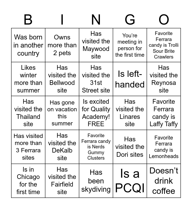 This bingo card has a free space and 34 words: Is wearing a Ferrara item of clothing, Is a PCQI, Has been at Ferrara for more than 20 years, Has been at Ferrara for less than 1 year, Has visited more than 3 Ferrara sites, Has visited the Bellwood site, Favorite Ferrara candy is Trolli Sour Brite Crawlers, Is in Chicago for the first time, Owns more than 2 pets, Favorite Ferrara candy is SweeTarts Ropes, Has visited the 31st Street site, Has visited the Maywood site, Has visited the Forest Park site, Has visited the Itasca site, Has visited the Linares site, Has visited the Reynosa site, Has visited the Fairfield site, Has visited the Thailand site, Has visited the DeKalb site, Has visited the Dori sites, Favorite Ferrara candy is Nerds Gummy Clusters, Has a birthday in August, Was born in another country, Favorite Ferrara candy is Laffy Taffy, Has been skydiving, Doesn’t drink coffee, You’re meeting in person for the first time, Has a hidden talent, Is left-handed, Likes winter more than summer, Has been to a concert this summer, Has gone on vacation this summer, Favorite Ferrara candy is Lemonheads and Has attended all 3 Quality Academies.
