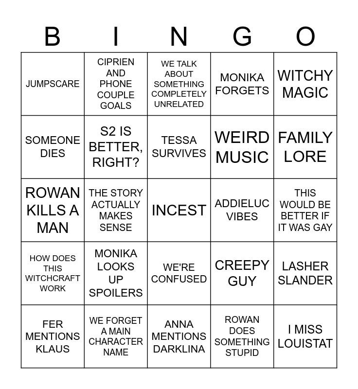 This bingo card has a free space and 43 words: THE WEIRD FADE, MONIKA LOOKS UP SPOILERS, BAD MANIP/CGI, ROWAN DOES SOMETHING STUPID, ROWAN FORGETS SHES A DOCTOR, FER MENTIONS KLAUS, S2 IS BETTER, RIGHT?, RANDOM FLASHBACK, MONIKA FORGETS, TALAMASCA, JUMPSCARE, WE FORGET A MAIN CHARACTER NAME, CREEPY GUY, LASHER SLANDER, TECHNICAL DIFFICULTIES, ROWAN KISSES A MAN, ANNA MENTIONS DARKLINA, ADDIELUC VIBES, PLOT, ROWAN KILLS A MAN, CIPRIEN AND PHONE COUPLE GOALS, WE'RE CONFUSED, IWTV MENTION, WITCHY MAGIC, ALEXANDRA DADDARIO FANCLUB, TESSA DIES, TESSA SURVIVES, EDITING REFERENCE, I MISS LOUISTAT, HOW DOES THIS WITCHCRAFT WORK, CARAVAL MENTION, WE TALK ABOUT SOMETHING COMPLETELY UNRELATED, ROWAN DRINKS/EATS SOMETHING SHE SHOULD NOT, THIS WOULD BE BETTER IF IT WAS GAY, "I HOPE THEY DIE", WE ACTUALLY LIKE AT LEAST ONE CHARACTER, PJO MENTION, FAMILY LORE, SOMEONE DIES, THE STORY ACTUALLY MAKES SENSE, KEYSMASH, WEIRD MUSIC and YA VIBES.