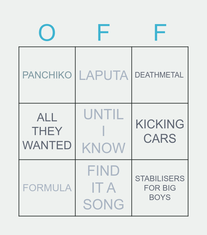 This bingo card has 9 words: FORMULA, DEATHMETAL, LAPUTA, ALL THEY WANTED, PANCHIKO, KICKING CARS, UNTIL I KNOW, STABILISERS FOR BIG BOYS and FIND IT A SONG.