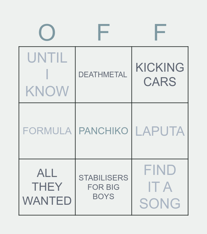 This bingo card has a free space and 8 words: FORMULA, DEATHMETAL, LAPUTA, ALL THEY WANTED, KICKING CARS, UNTIL I KNOW, STABILISERS FOR BIG BOYS and FIND IT A SONG.
