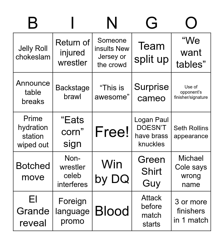 This bingo card has a free space and 24 words: El Grande reveal, Non-wrestler celeb interferes, “This is awesome”, Attack before match starts, “We want tables”, Jelly Roll chokeslam, Return of injured wrestler, Someone insults New Jersey or the crowd, Logan Paul DOESN’T have brass knuckles, Seth Rollins appearance, Prime hydration station wiped out, Backstage brawl, Green Shirt Guy, Michael Cole says wrong name, Announce table breaks, Foreign language promo, Blood, Team split up, Use of opponent’s finisher/signature, Botched move, “Eats corn” sign, Win by DQ, Surprise cameo and 3 or more finishers in 1 match.