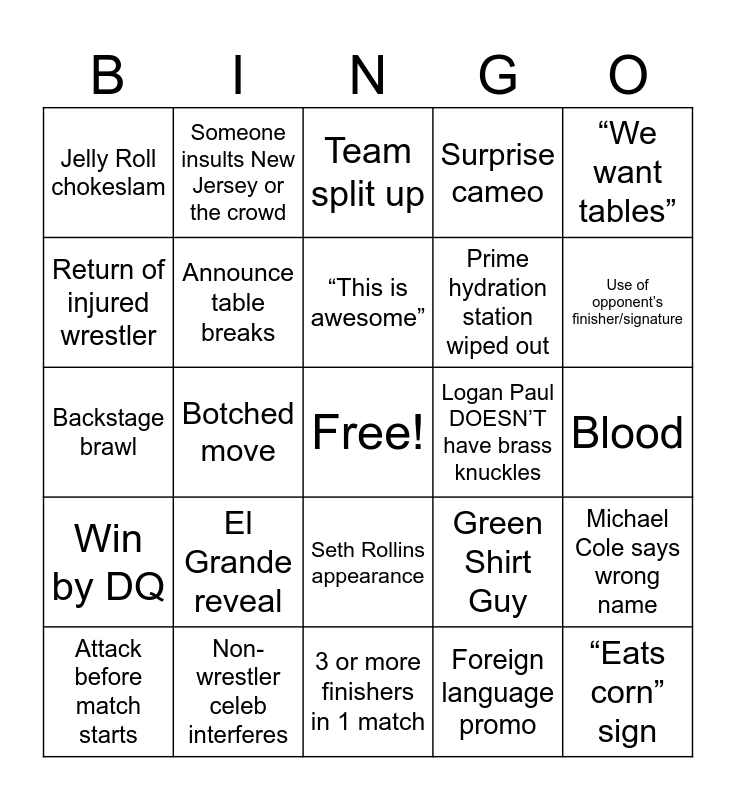 This bingo card has a free space and 24 words: El Grande reveal, Non-wrestler celeb interferes, “This is awesome”, Attack before match starts, “We want tables”, Jelly Roll chokeslam, Return of injured wrestler, Someone insults New Jersey or the crowd, Logan Paul DOESN’T have brass knuckles, Seth Rollins appearance, Prime hydration station wiped out, Backstage brawl, Green Shirt Guy, Michael Cole says wrong name, Announce table breaks, Foreign language promo, Blood, Team split up, Use of opponent’s finisher/signature, Botched move, “Eats corn” sign, Win by DQ, Surprise cameo and 3 or more finishers in 1 match.