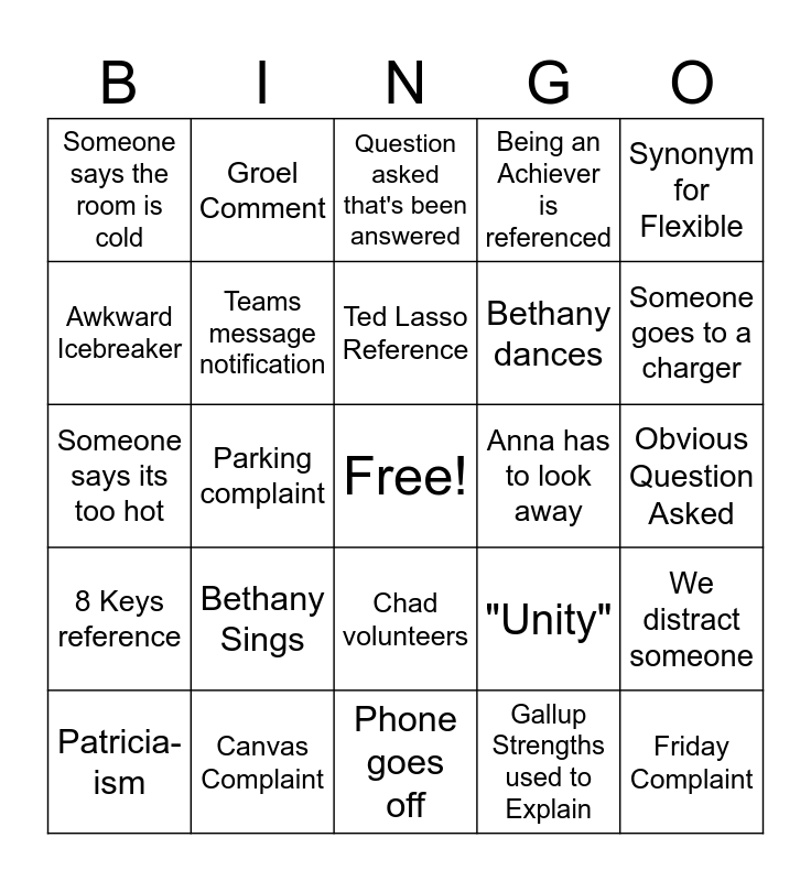 This bingo card has a free space and 25 words: Bethany Sings, Phone goes off, Ted Lasso Reference, Patricia-ism, Synonym for Flexible, Someone says the room is cold, Awkward Icebreaker, Groel Comment, Anna has to look away, Chad volunteers, Bethany dances, Someone says its too hot, "Unity", We distract someone, Teams message notification, Technical Difficulty, Obvious Question Asked, Question asked that's been answered, Someone goes to a charger, Parking complaint, Friday Complaint, Canvas Complaint, 8 Keys reference, Being an Achiever is referenced and Gallup Strengths used to Explain.