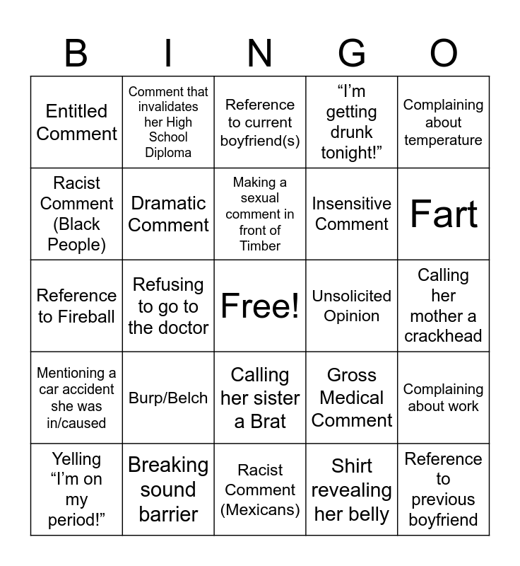 This bingo card has a free space and 24 words: Burp/Belch, Breaking sound barrier, Making a sexual comment in front of Timber, Yelling “I’m on my period!”, Complaining about temperature, Entitled Comment, Racist Comment (Black People), Comment that invalidates her High School Diploma, Unsolicited Opinion, Calling her sister a Brat, Insensitive Comment, Reference to Fireball, Gross Medical Comment, Complaining about work, Dramatic Comment, Shirt revealing her belly, Calling her mother a crackhead, Reference to current boyfriend(s), Fart, Refusing to go to the doctor, Reference to previous boyfriend, Mentioning a car accident she was in/caused, “I’m getting drunk tonight!” and Racist Comment (Mexicans).